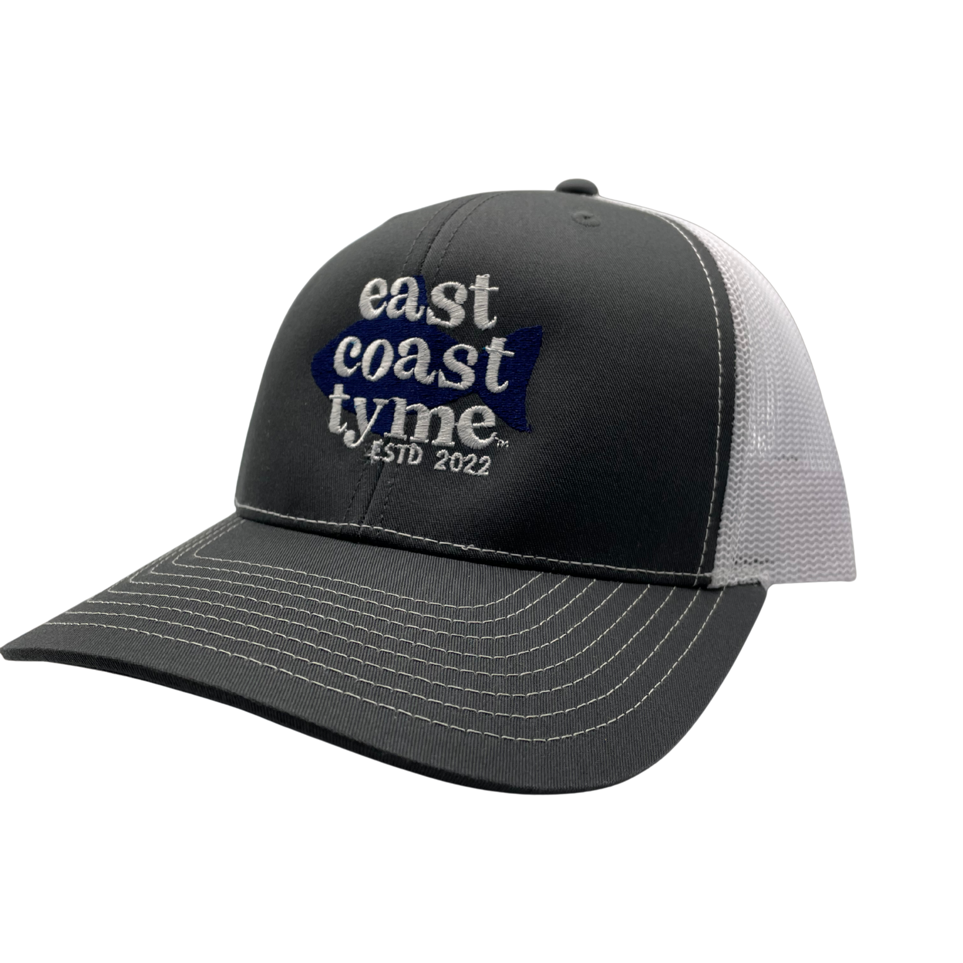 East Coast Tyme blue fish logo embroidered on a Richardson® original trucker hat. Adjustable band.